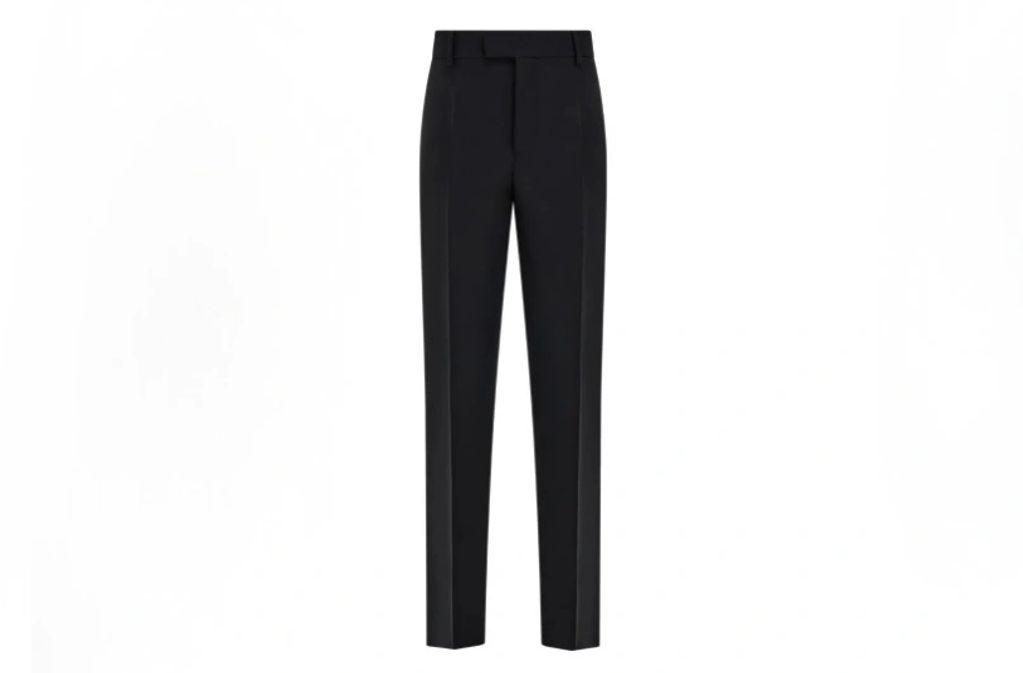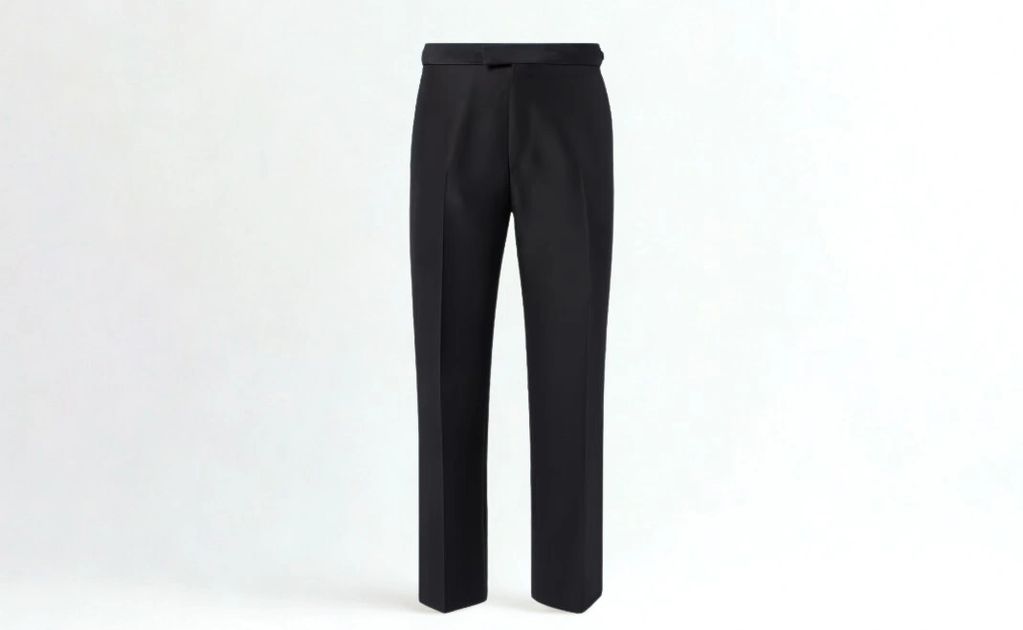 Flat front trouser with two front pockets and two back jet pockets.